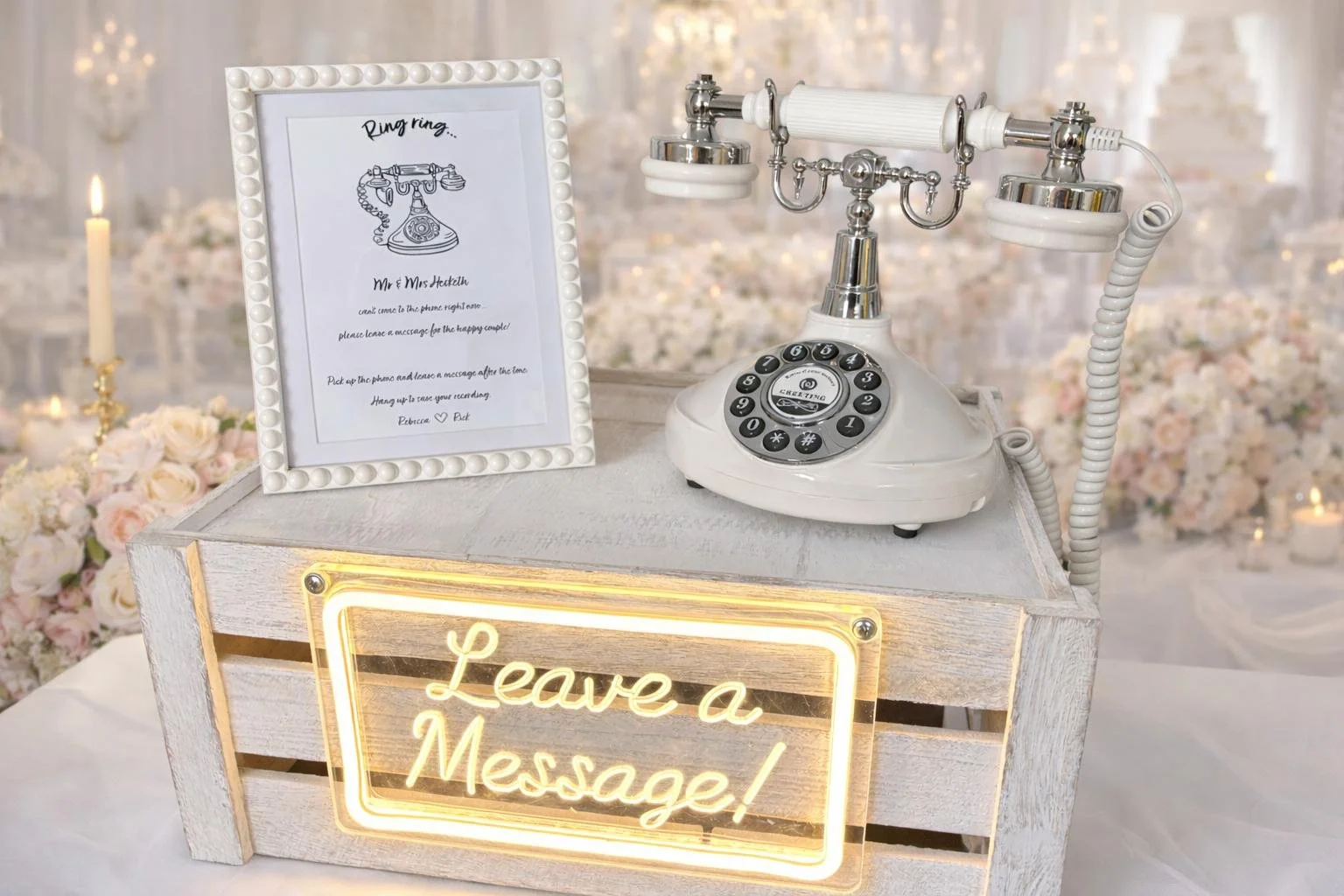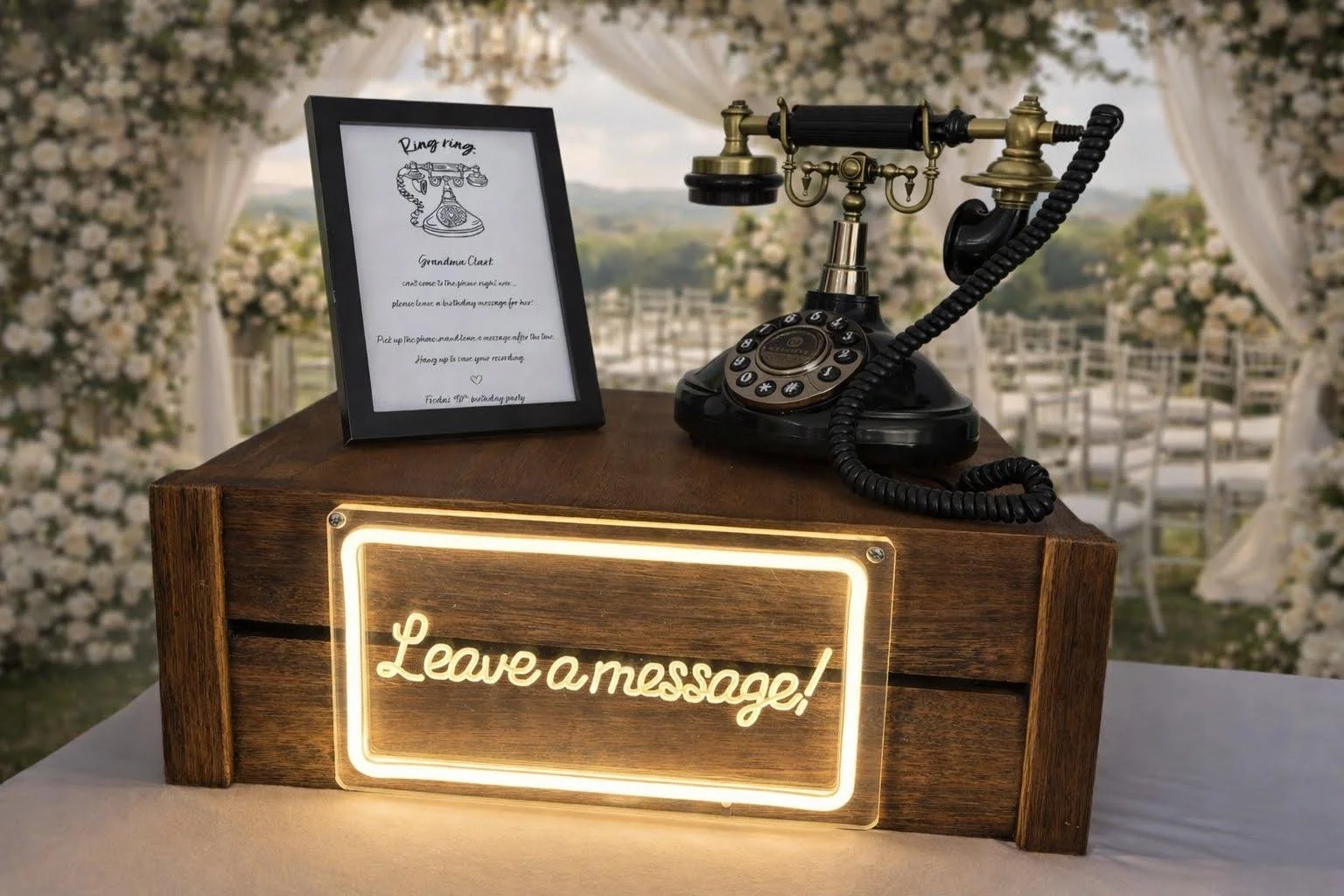 Each guestbook comes beautifully presented on a rustic wooden stand, complete with a glowing neon light to draw attention and add a touch of charm to your setup. After your event, we’ll carefully compile all your recordings and deliver them to you on a USB stick, so you can relive those special moments anytime.